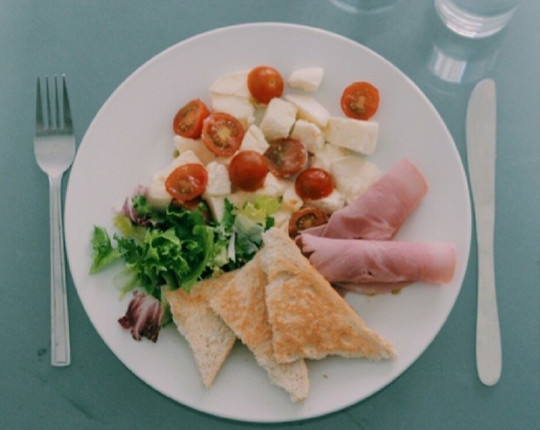 Healthy and light: toasts, rocket, mozzarella, cherry tomatoes and ham.