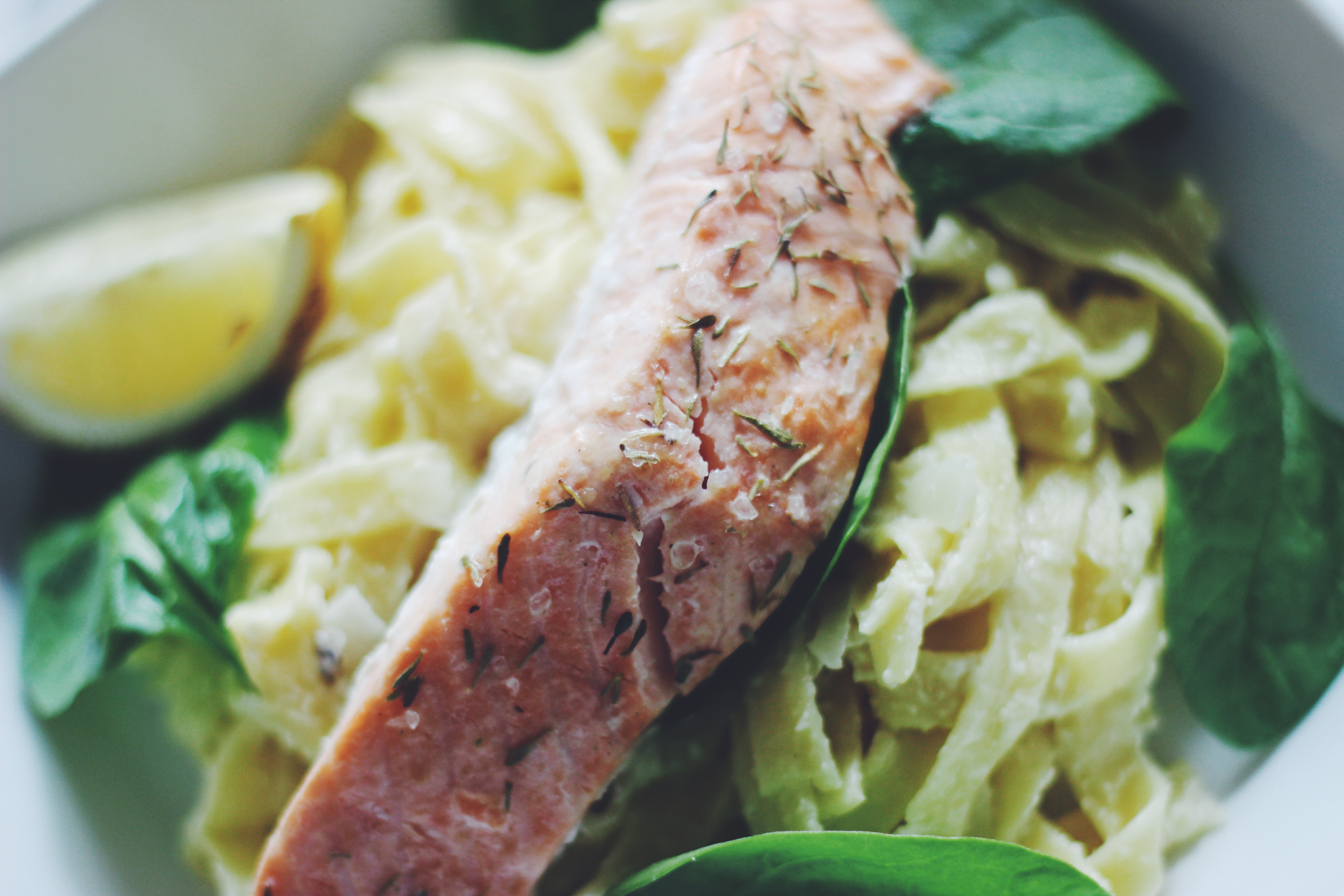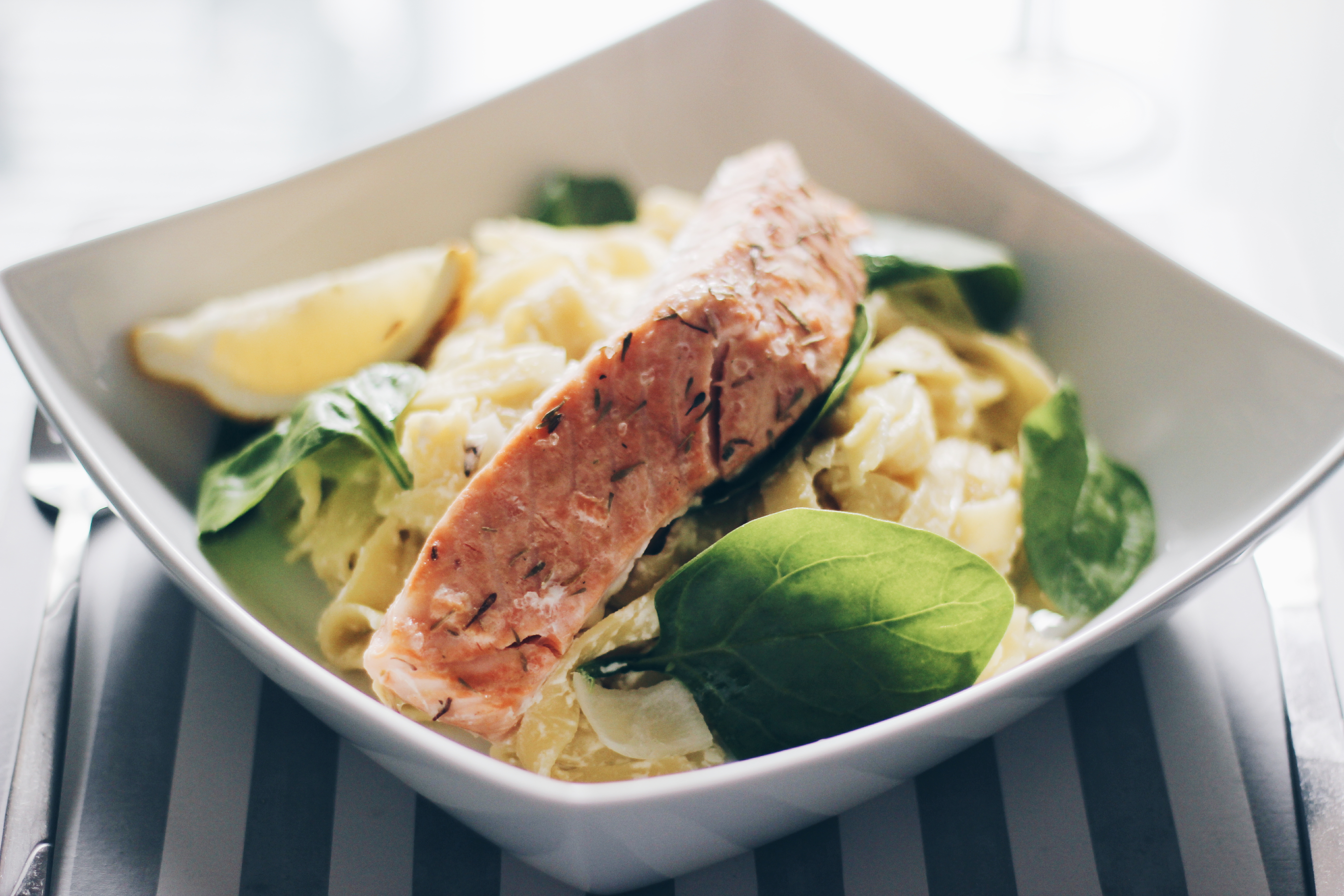 6. Serve the salmon and pasta with a few fresh spinach leaves as seen on the photos. Enjoy!