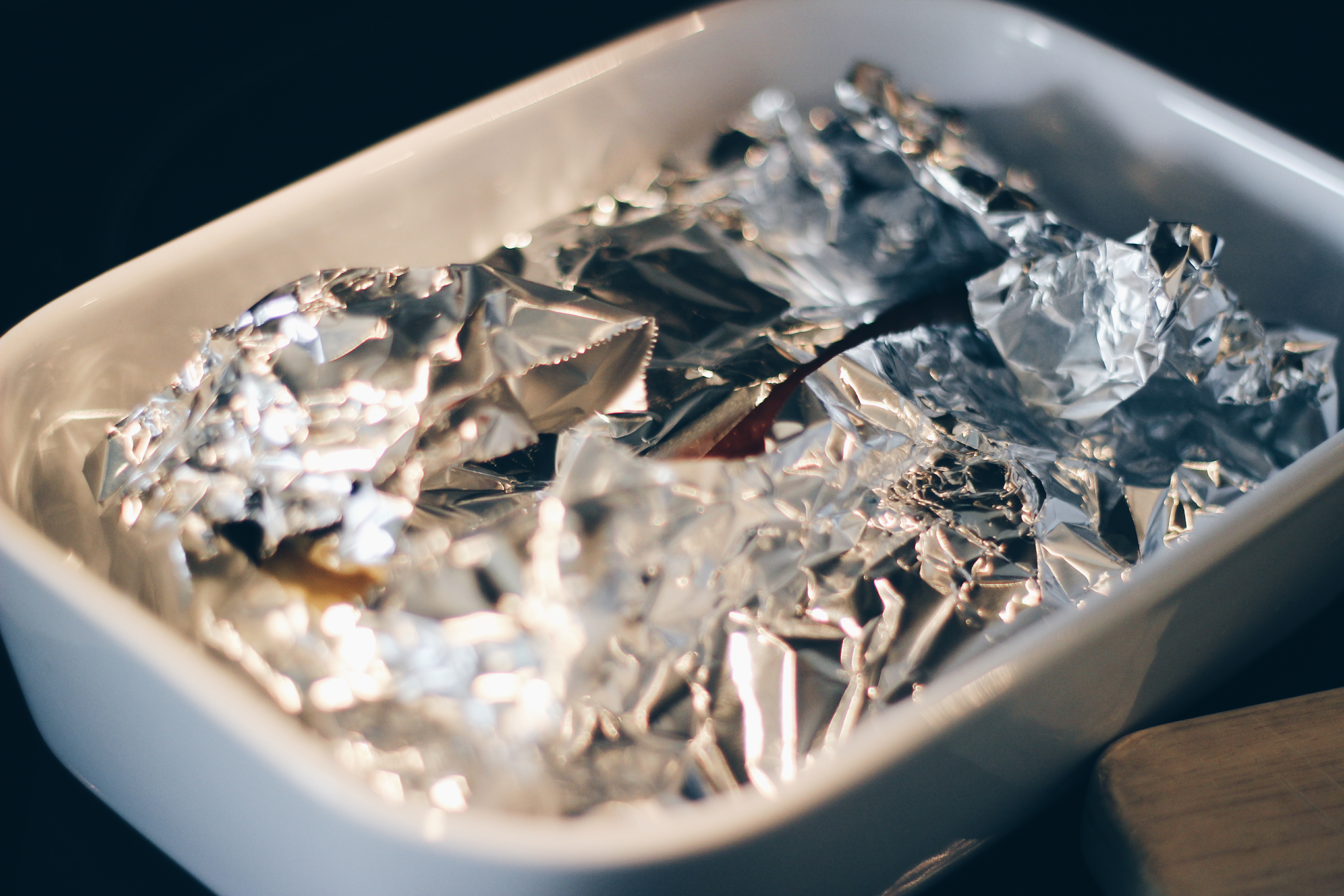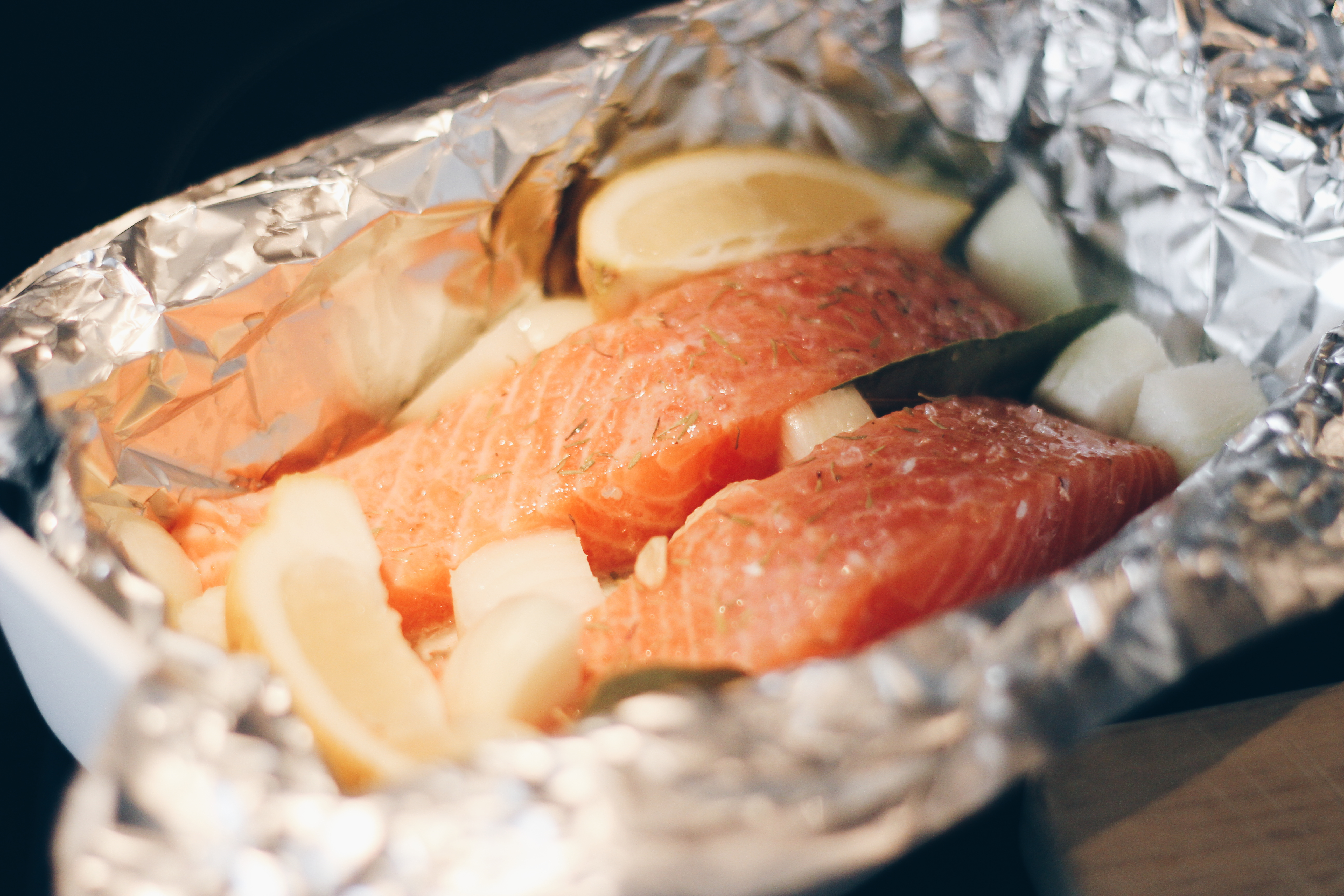 2. Pour the juice from a lemon over the salmon, wrap it in foil, inside a small ceramic tray and a bit of olive oil. Alongside chopped onions, and/or vegetables of your choice (e.g. cherry tomatoes, carrots etc.)