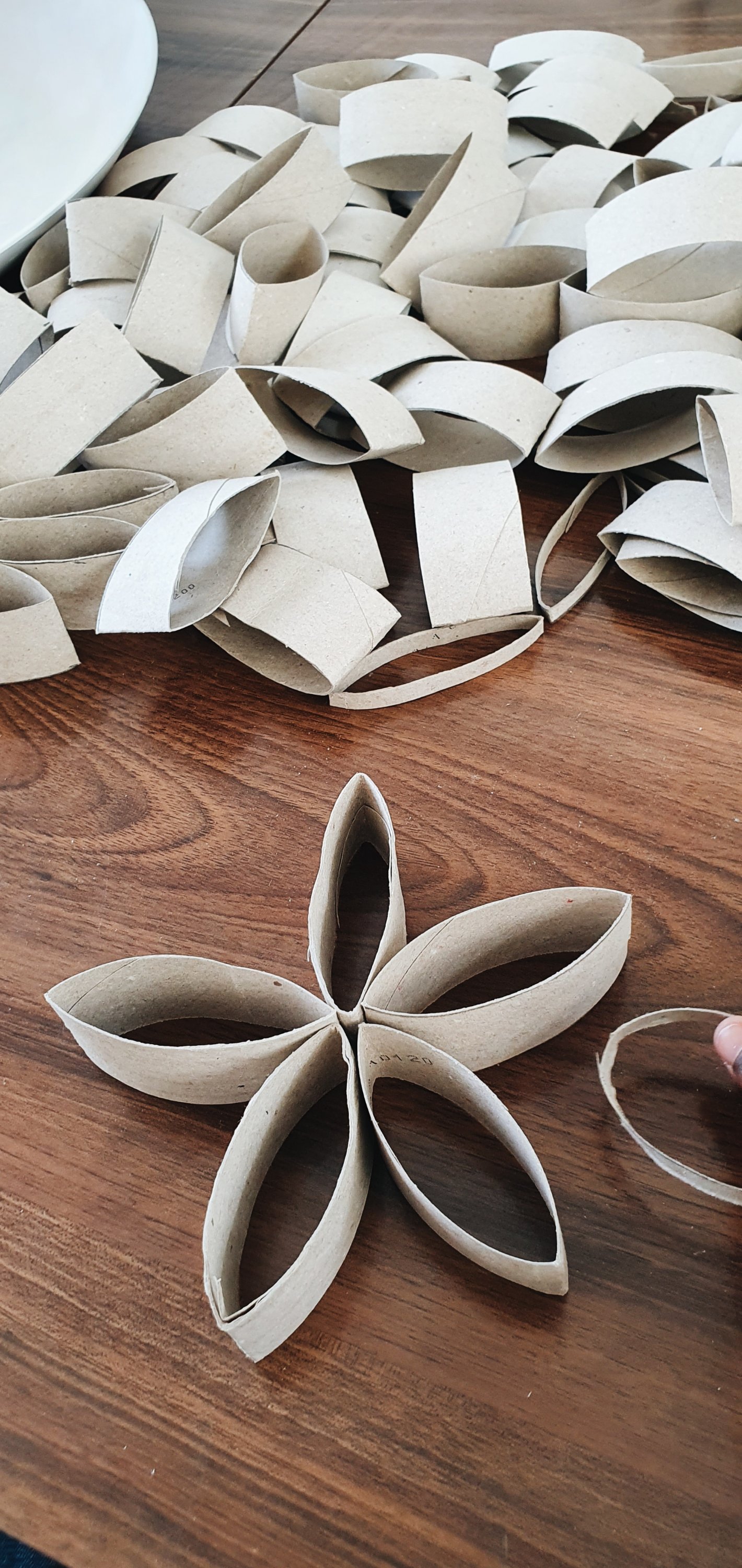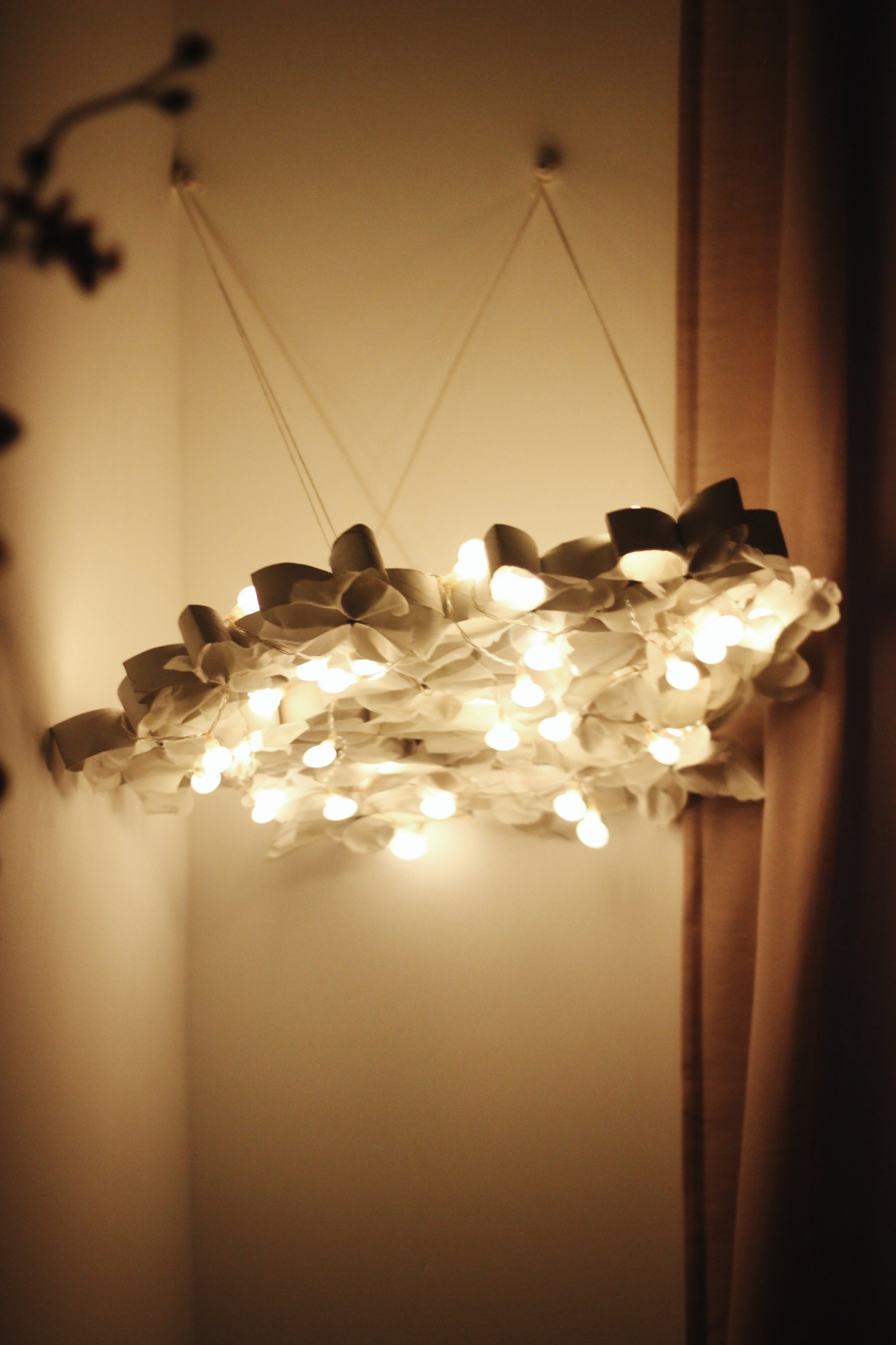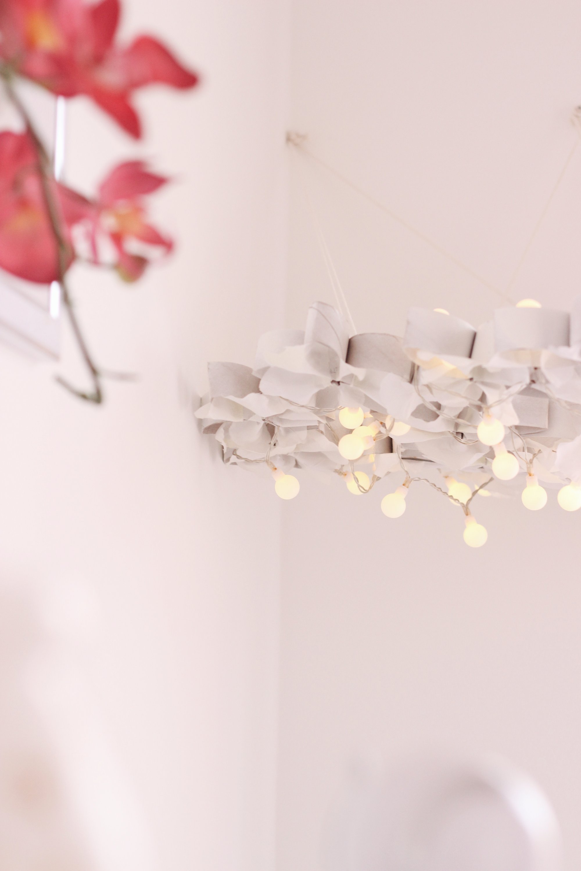 The toilet roll flower craft thing – I’ve seen before on Pinterest. I collected empty rolls for a few weeks (I always do, for arts and crafts!) And I used that method to create the base of my chandelier.