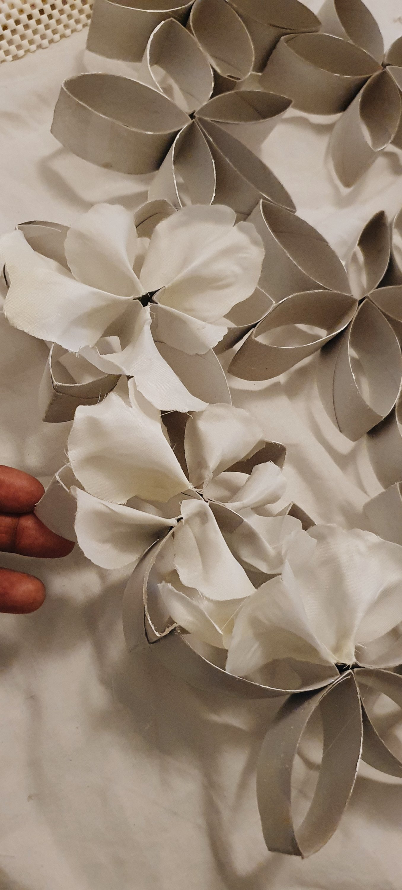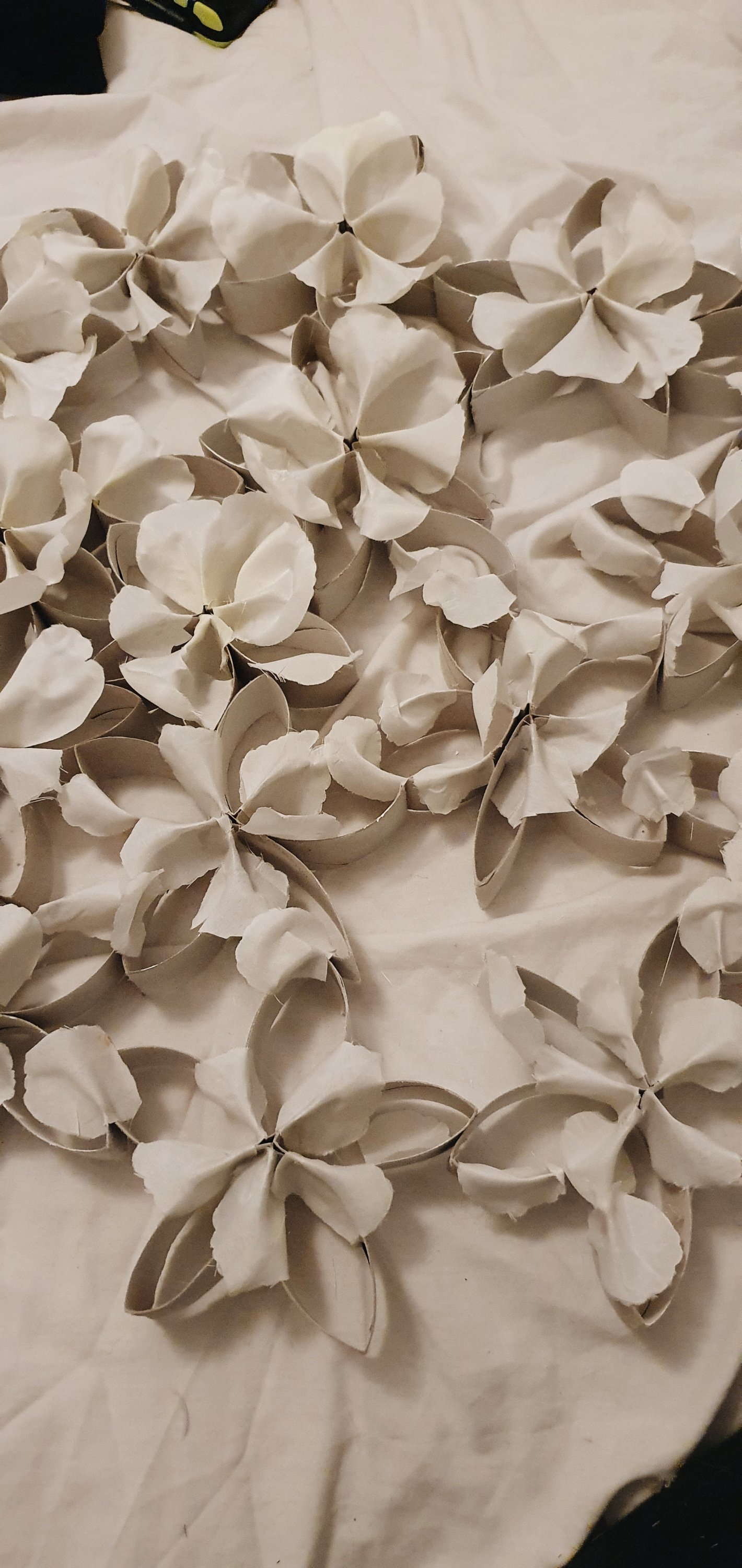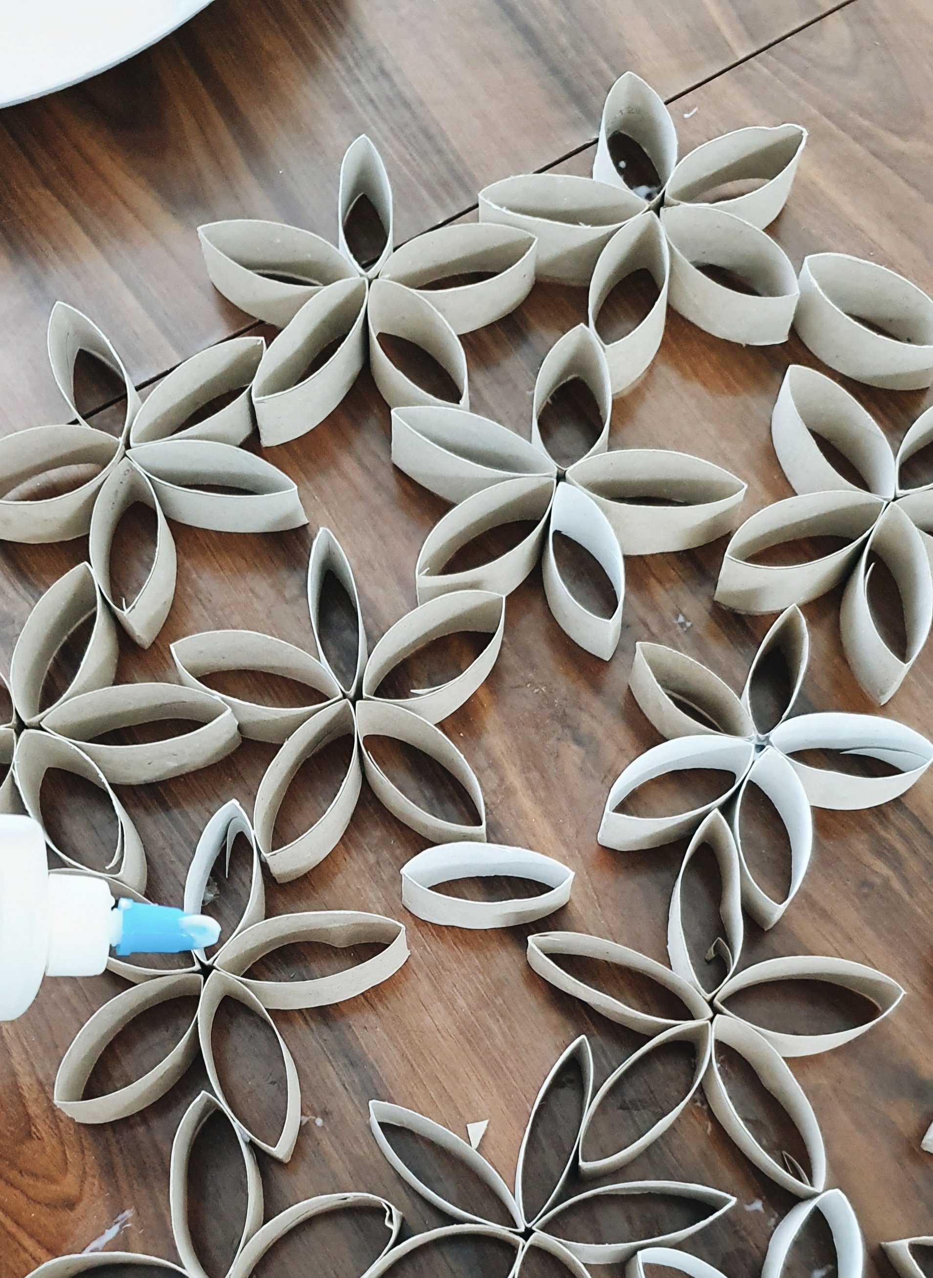 The toilet roll flower craft thing – I’ve seen before on Pinterest. I collected empty rolls for a few weeks (I always do, for arts and crafts!) And I used that method to create the base of my chandelier.