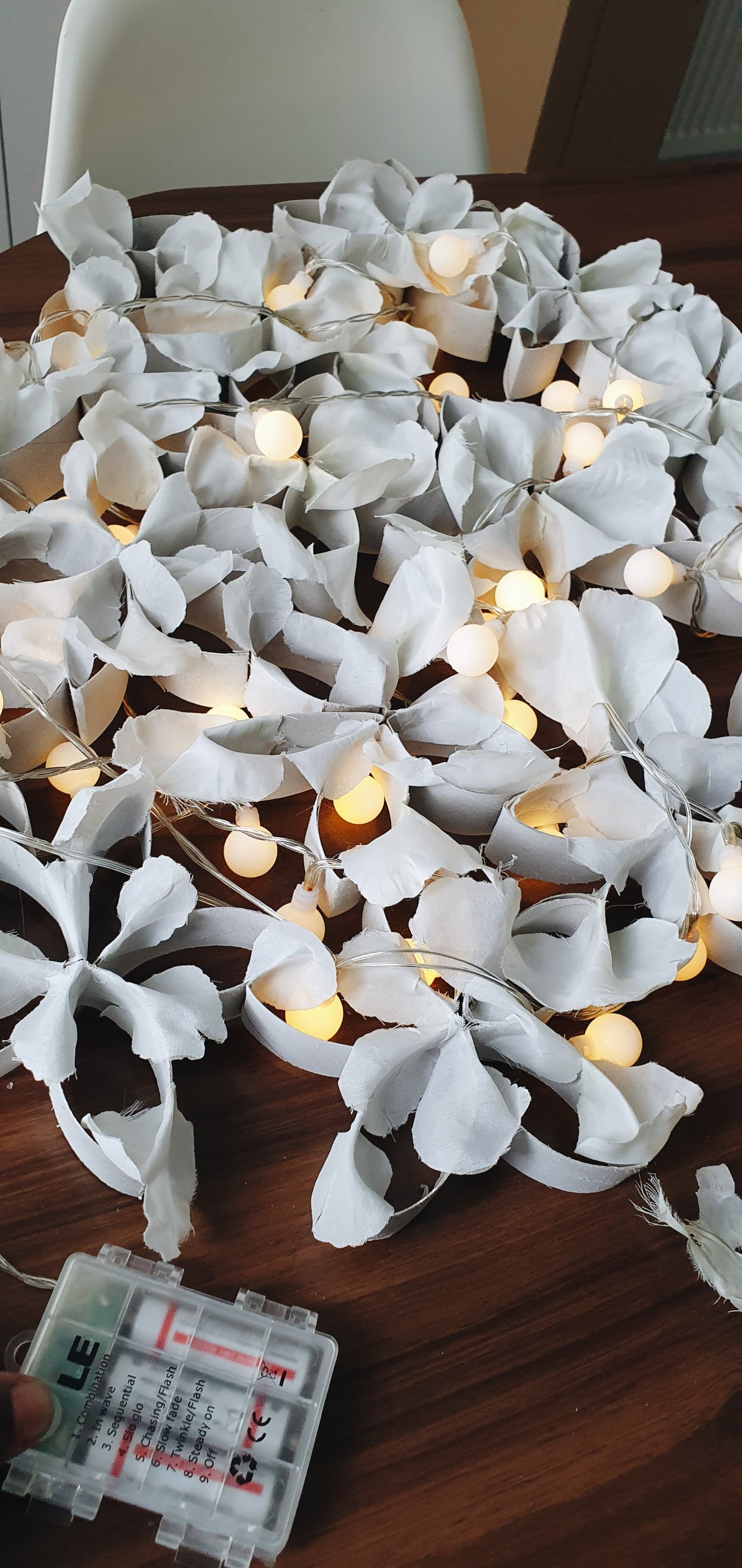 After sicking the flowers, and after making sure everything was dry, the next thing I did was to meticulously insert some fairy lights into the piece. You want to insert them in the larger holes/gaps first, and then ‘secure’ the piece by going through the smaller holes.