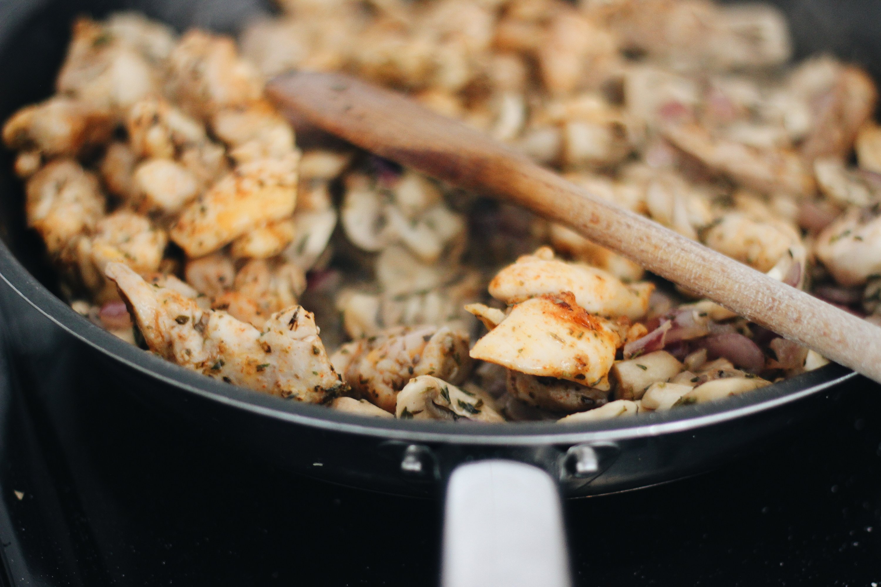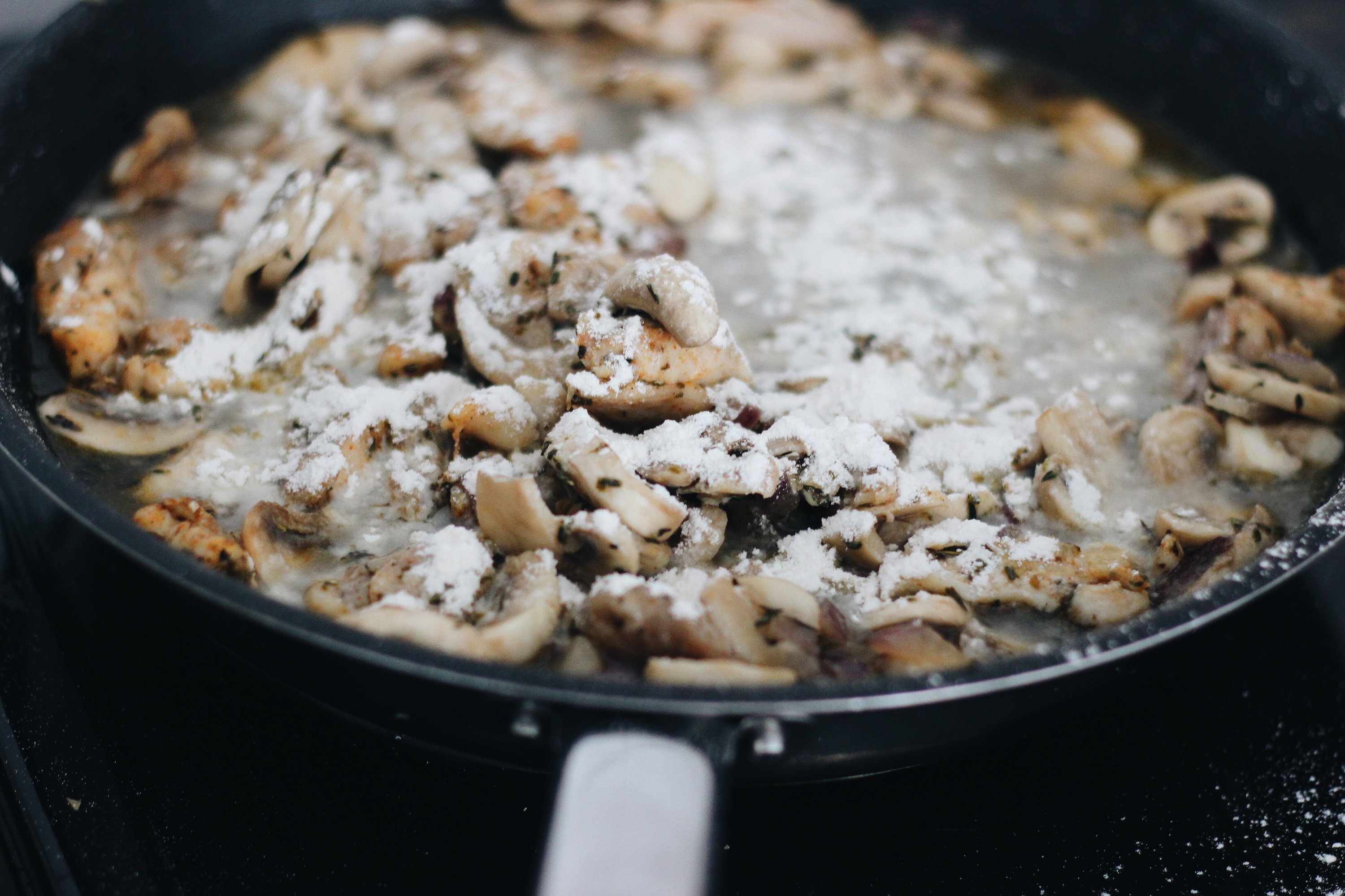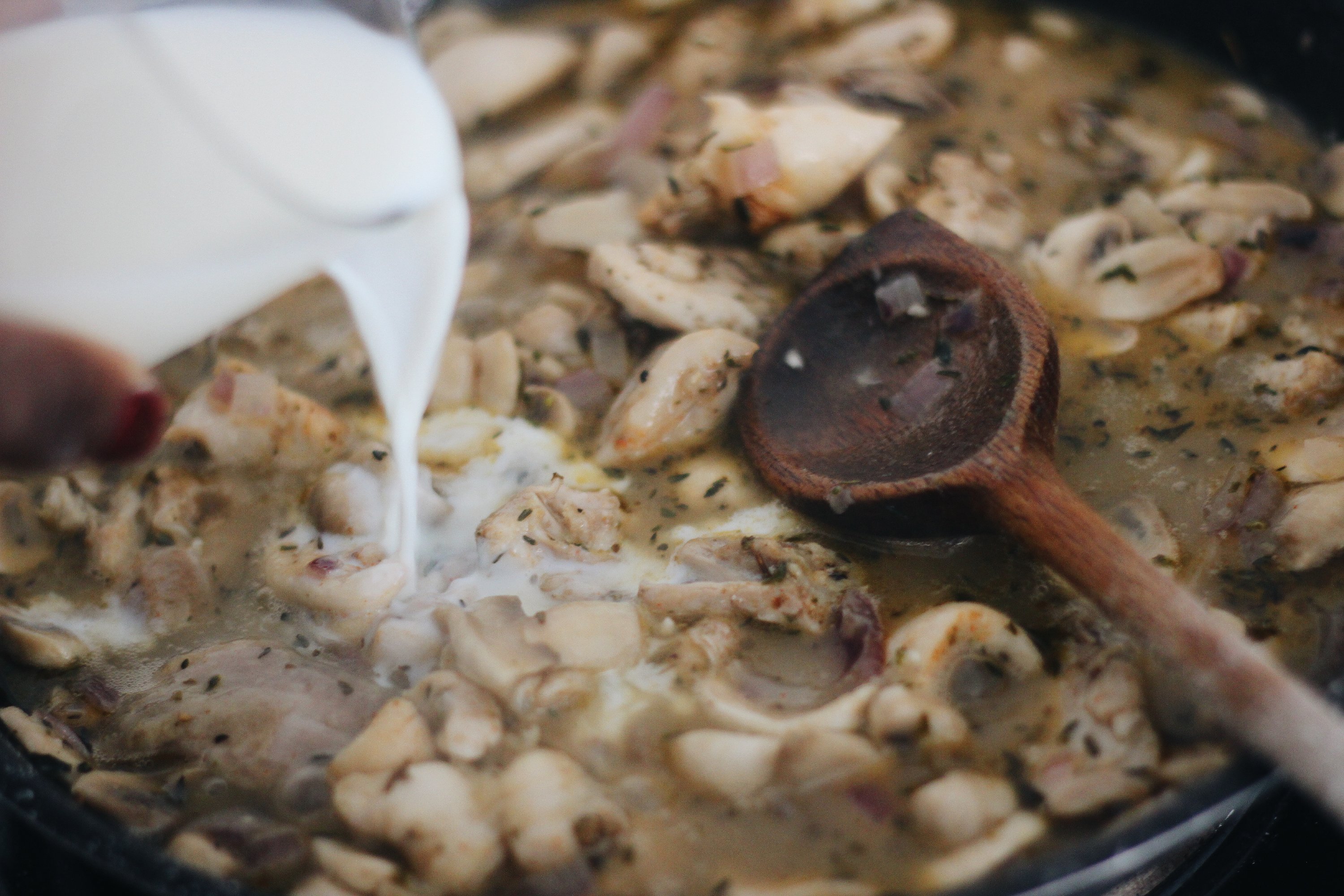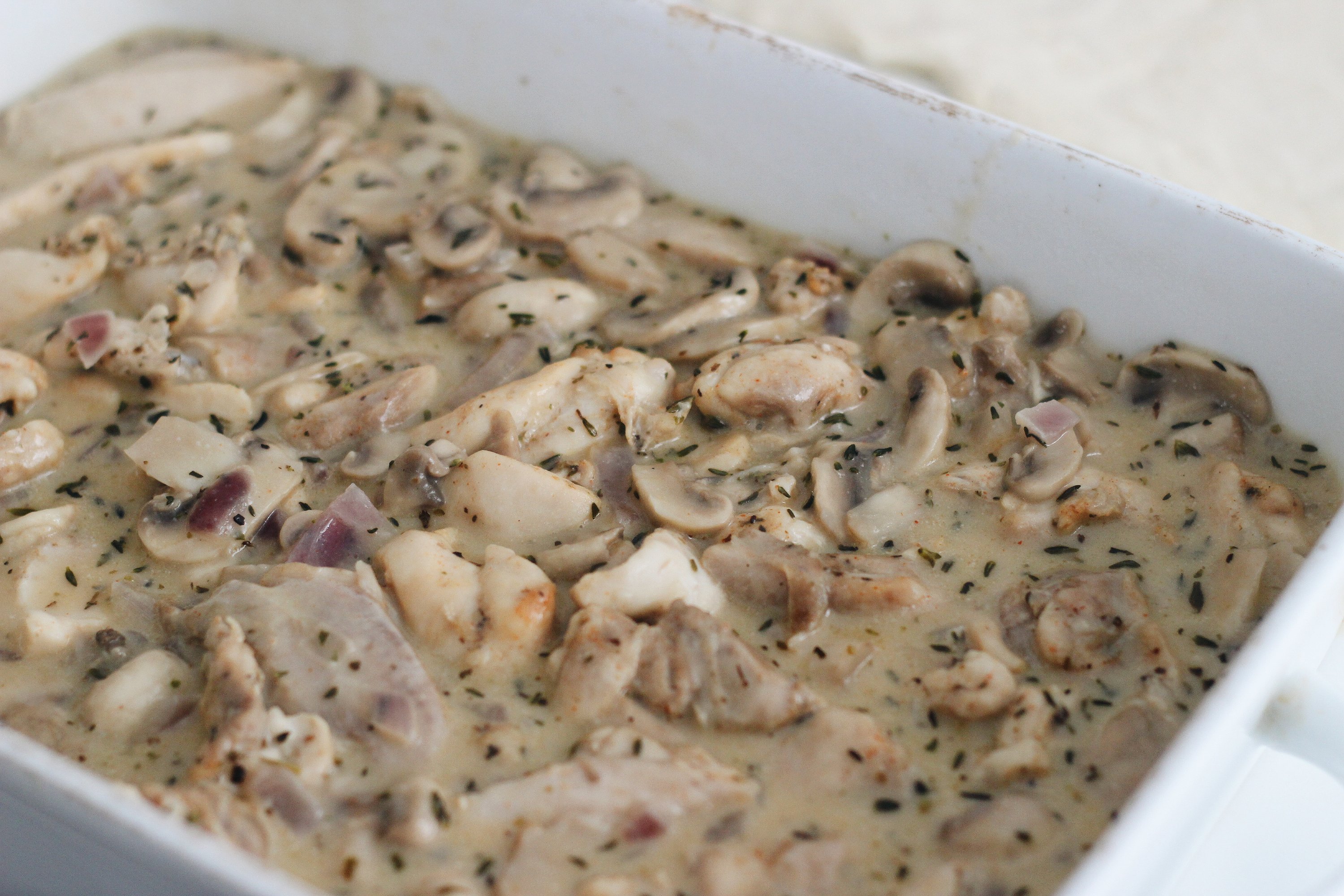 Pour the chicken and mushroom mixture into an oven dish.