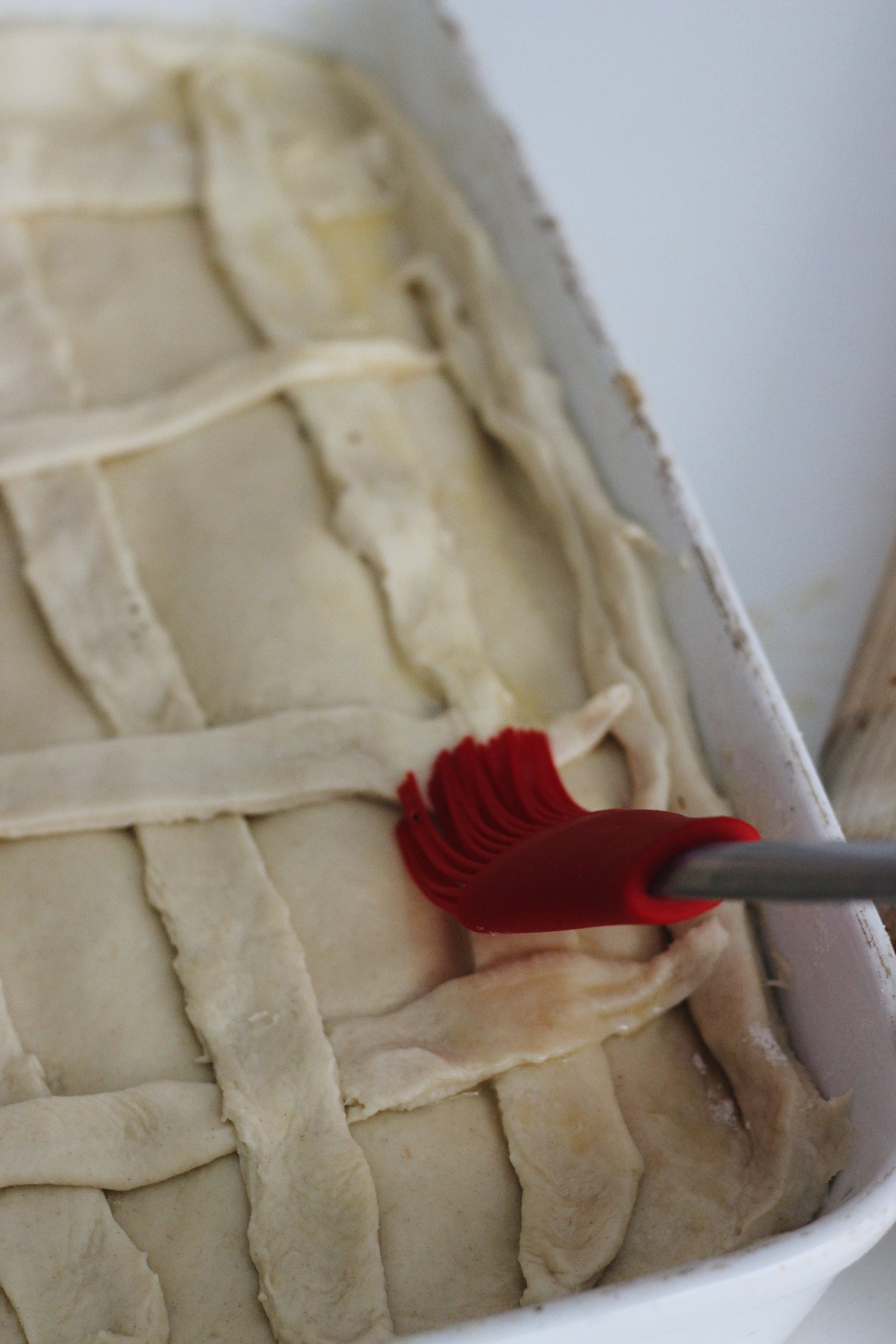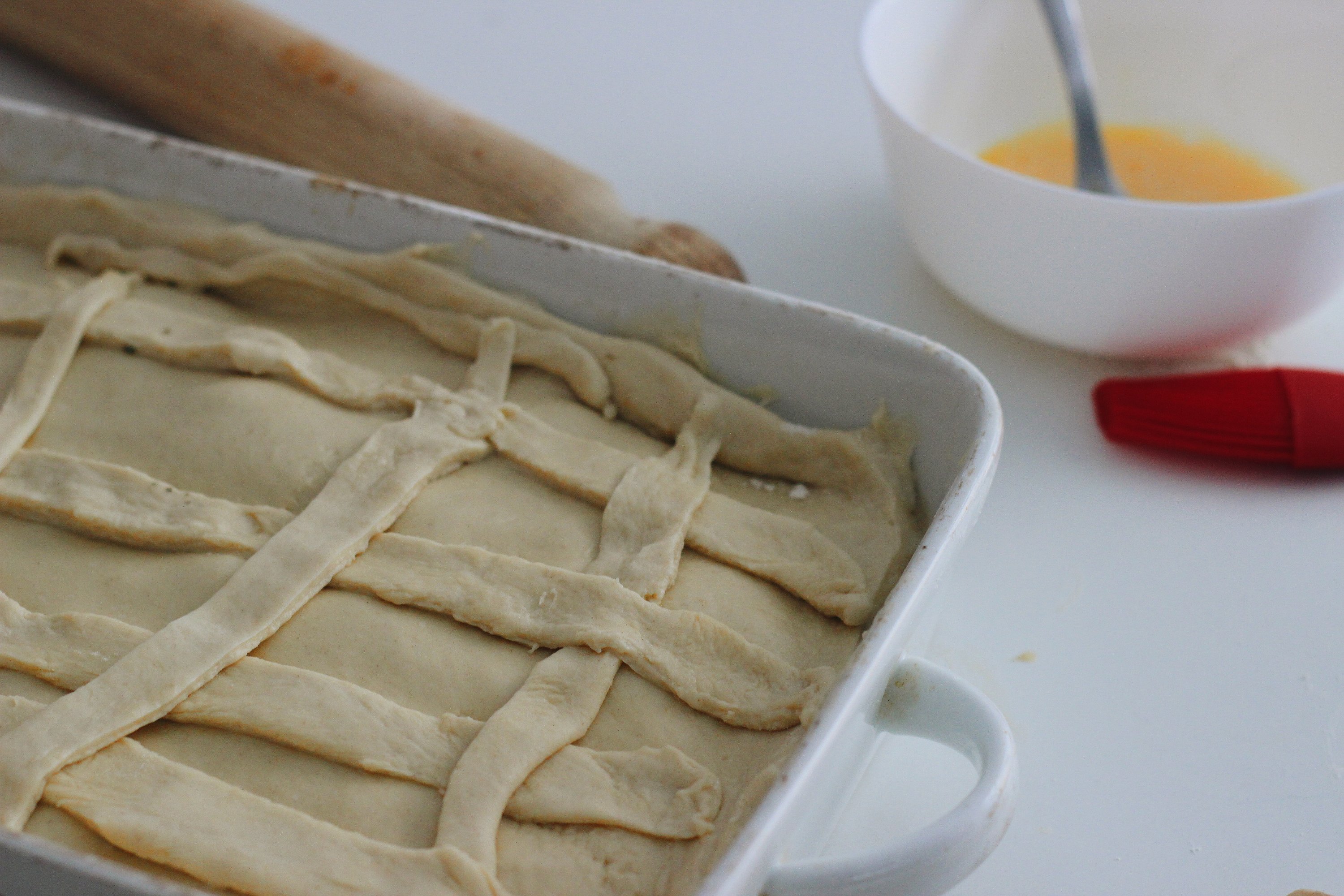 Brush the pastry with a little bit of the beaten egg, to glaze.