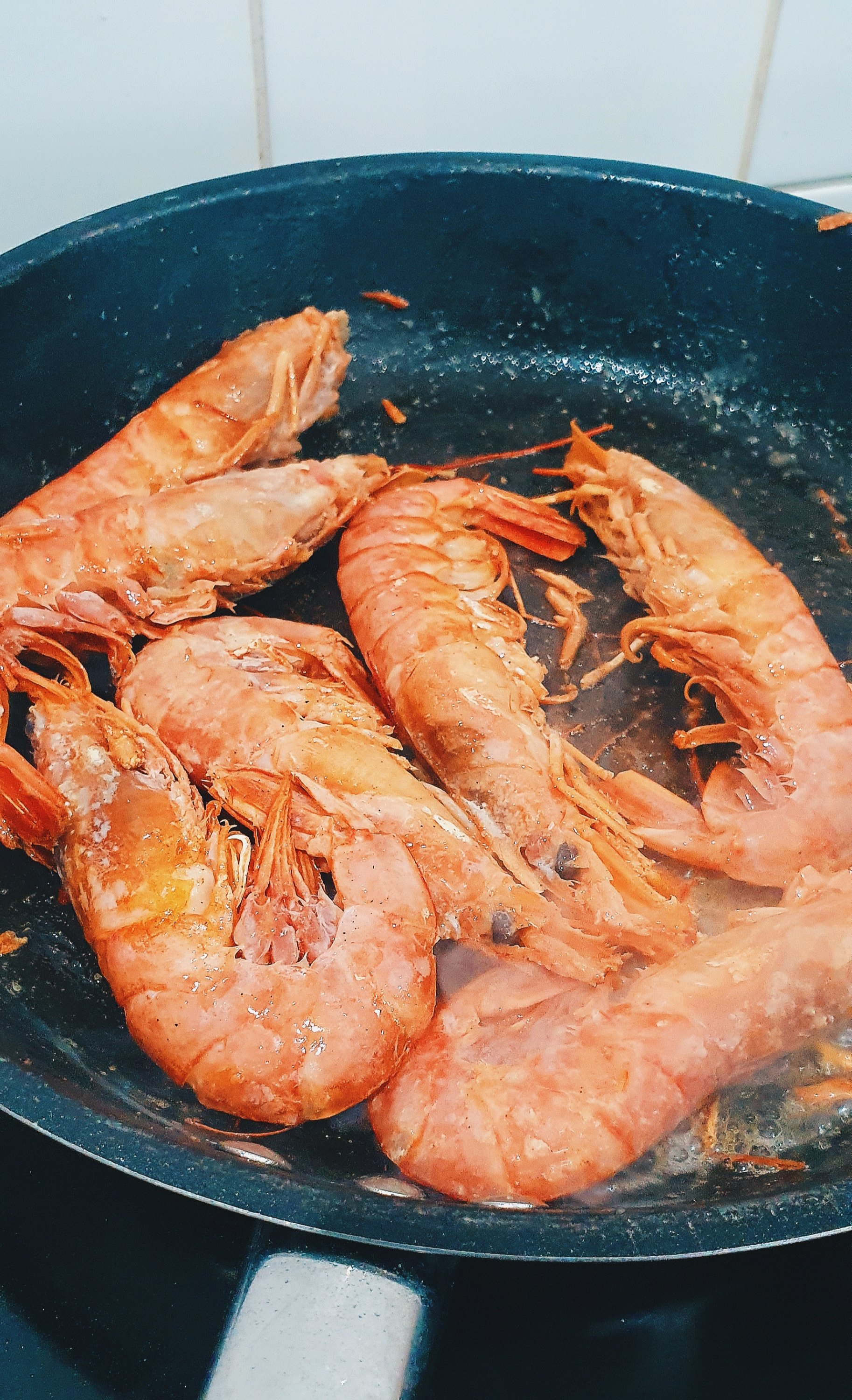 1. In a shallow pan, sautee the prawns in a generous amount of butter, on medium heat, for 8-10 minutes. Turn them over regularly to avoid them sticking to the pan.
