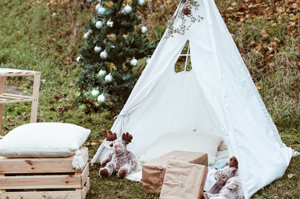 It all starts with a scene. I opted for the idea of an ‘enchanted garden’, which is reminiscent of enchanted forests children read about in their favourite tales. You could easily recreate a small village within the garden, with a little house and other homely elements. For our Christmas-themed village, we imagined a grotto and created one using a teepee tent. It did the job! A few Christmas decorations, my daughter’s toy reindeers for that authentic Christmas grotto look, a bag filled with presents, Christmas music playing in the background and there you have it: Santa’s grotto and a beautifully re-enacted winter wonderland!