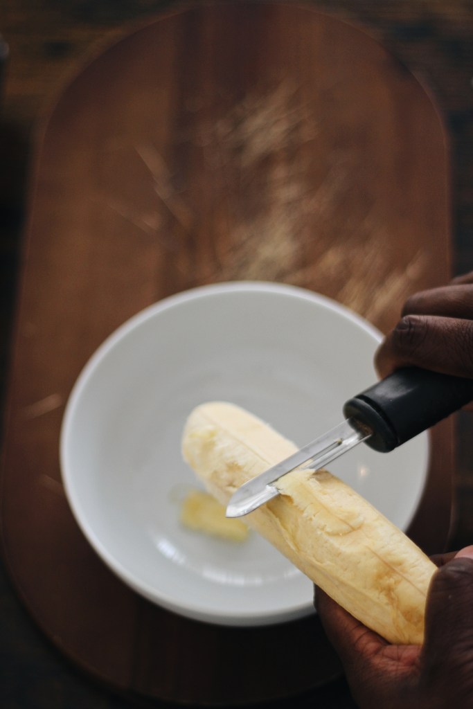 - Using a potato peeler, carefully peel the plantain, then create little mountains out of the peelings, like so: