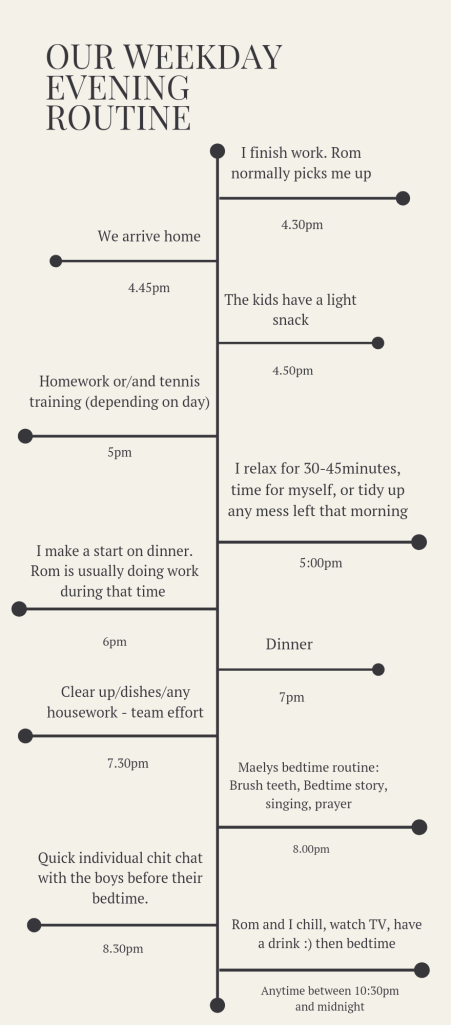 Here are our morning and evening routines, for most weekdays. Of course some days will look different – tennis lessons, tuition and other activities may affect our routines, but the ‘foundation’ tends to stay the same.