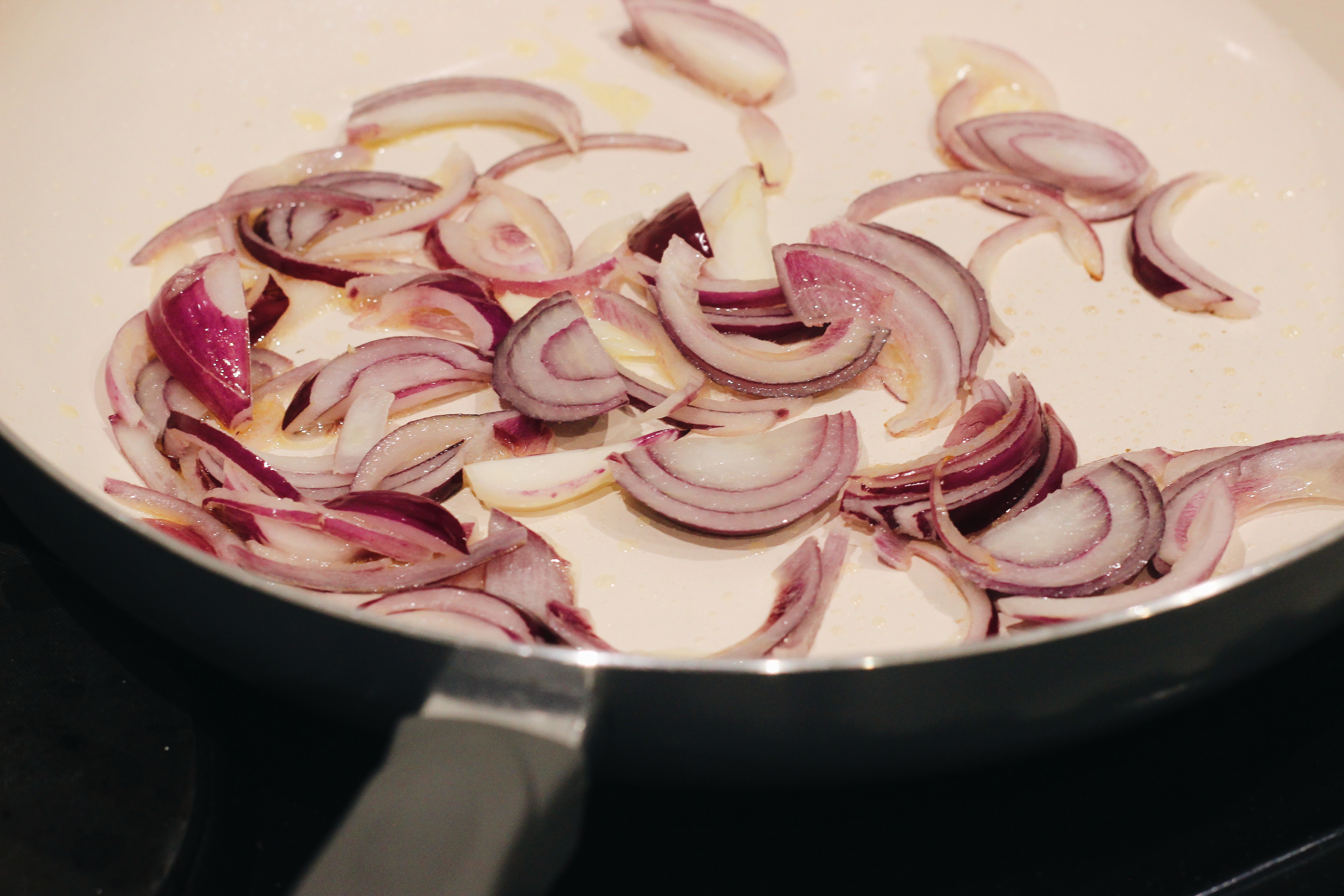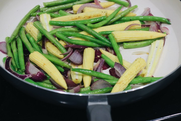 4. Slice the red onion and in another pan, fry it in a knob of butter, before adding the green beans and baby corn. Season with sea salt and black peppercorn.