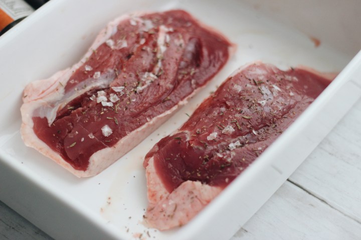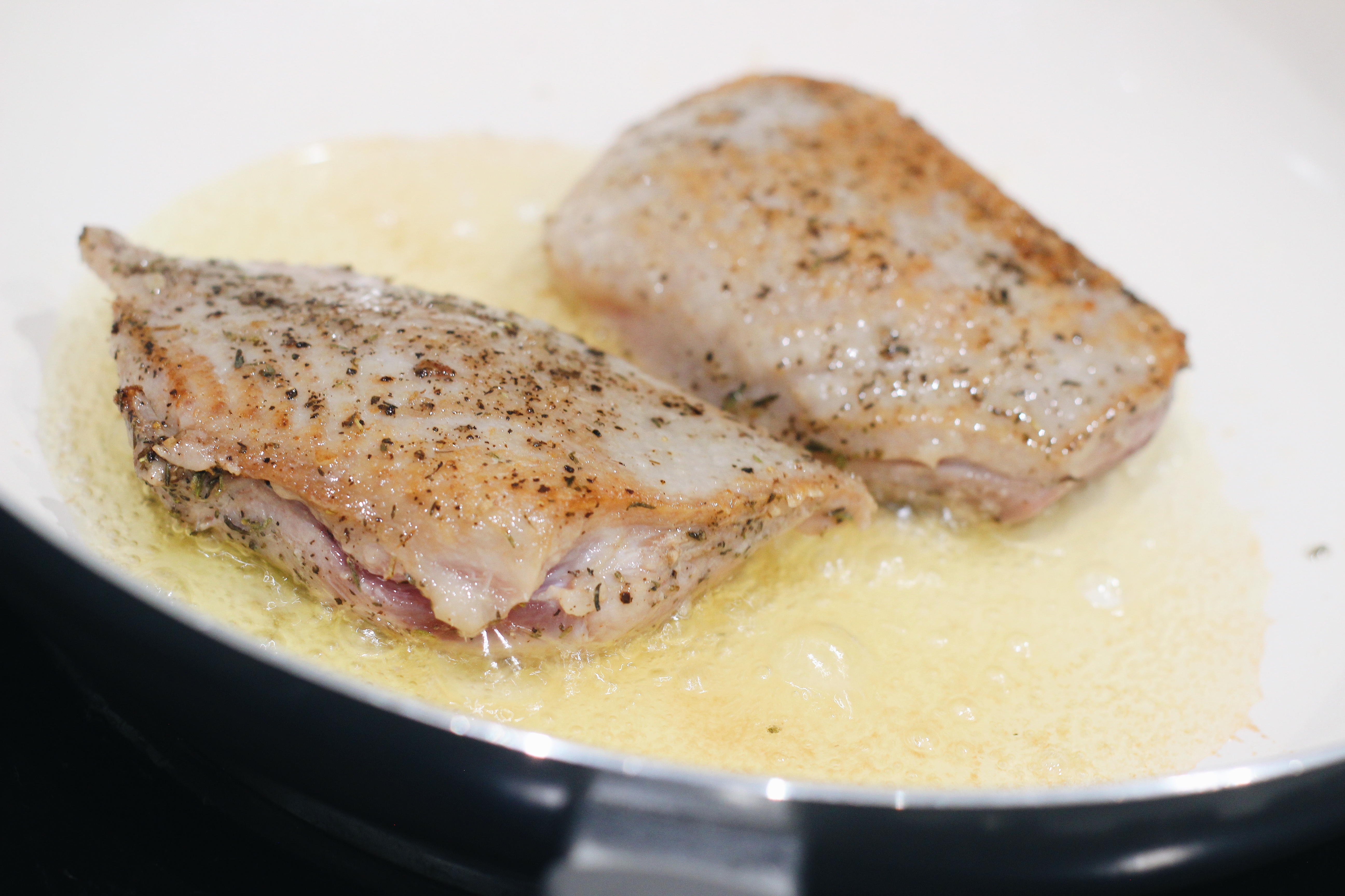 1. Start by seasoning the duck breasts with sea salt, black peppercorn and thyme, and then in a shallow pan, sear the fillets in some olive oil, for 2 minutes on each side. Although duck already has a lot of fat, the olive oil will be needed for the rest of the recipe so do not discard it; set it aside.
