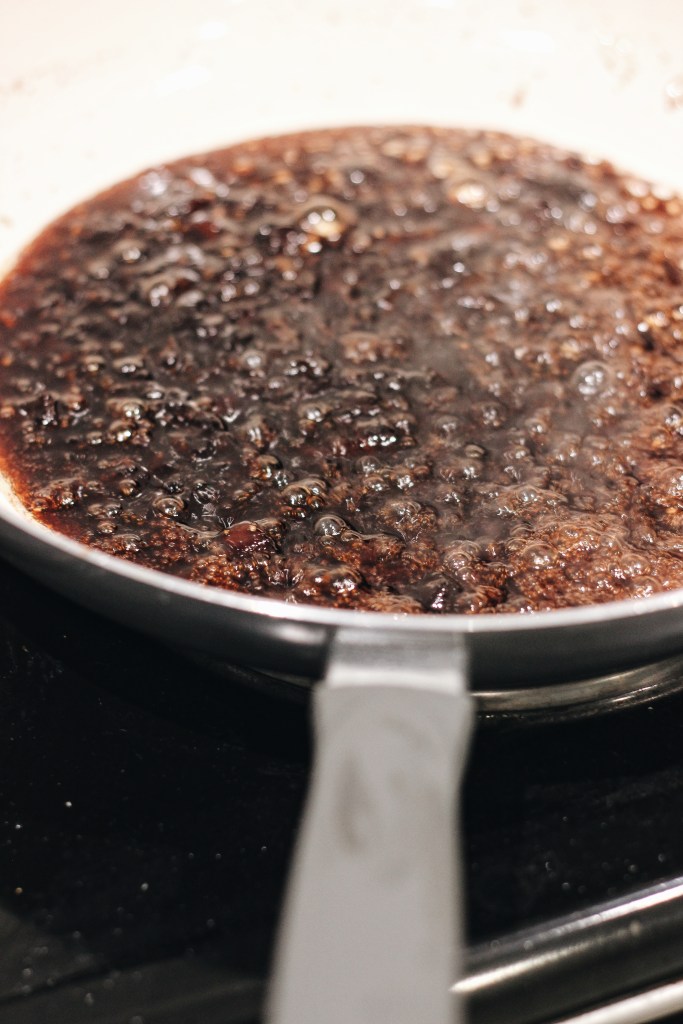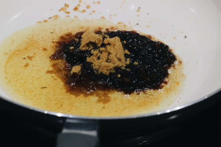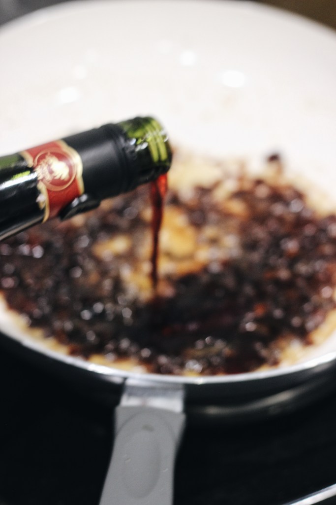 3. Using the same pan and the remainder of the olive oil, add the caramelised onion chutney, the Worcester sauce, and the brown sugar, followed by the red wine. Stir gently and let it simmer and reduce for about 7 minutes on medium heat. Keep stirring occasionally to ensure it doesn’t stick to the pan.