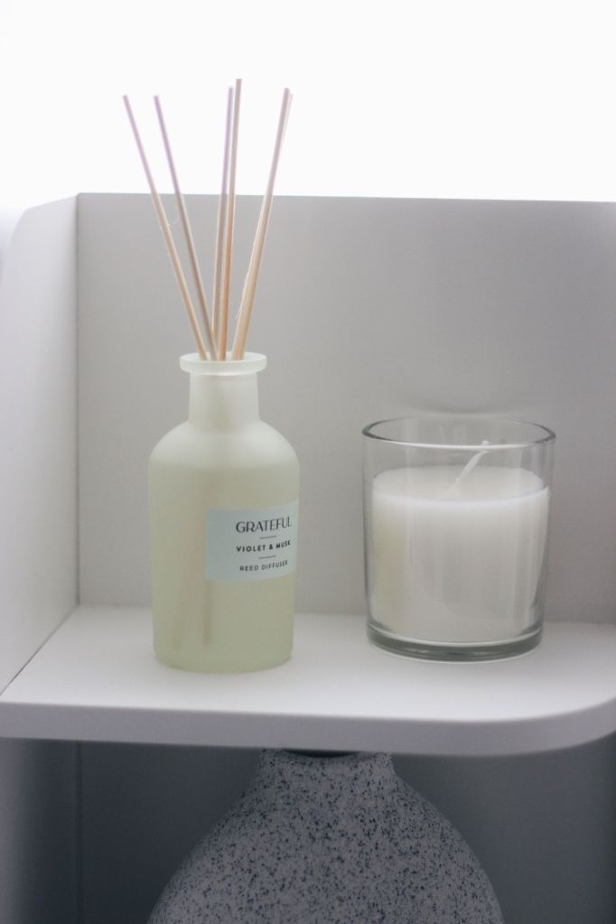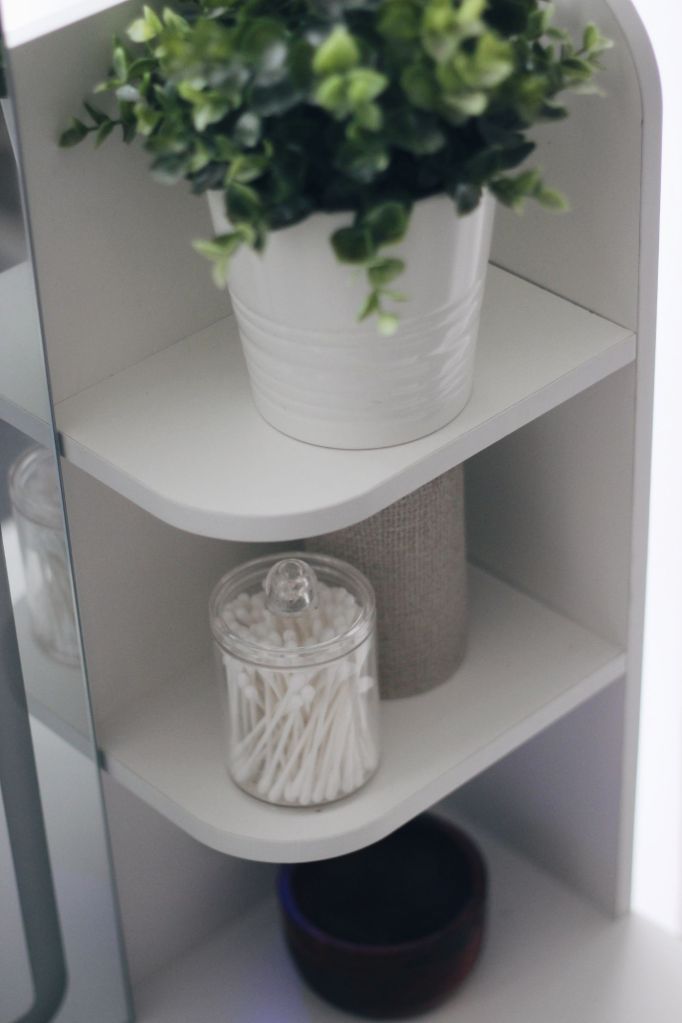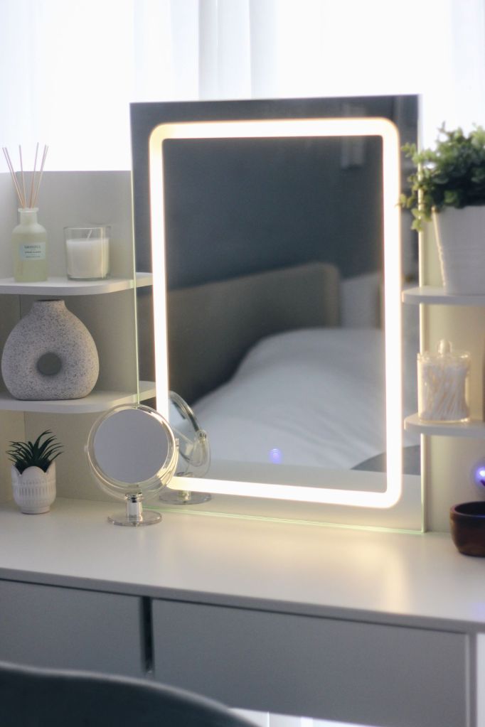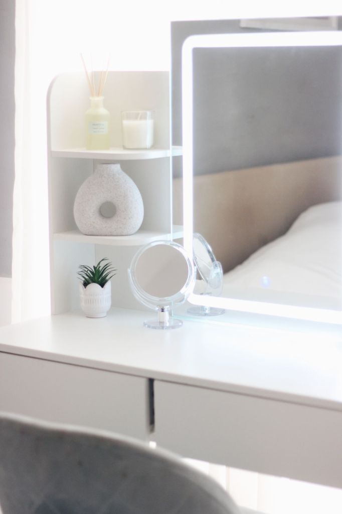 My latest addition? A white vanity table with an LED mirror, shelves, and drawers, perfectly suited to the coastal-neutral vibes of my bedroom.